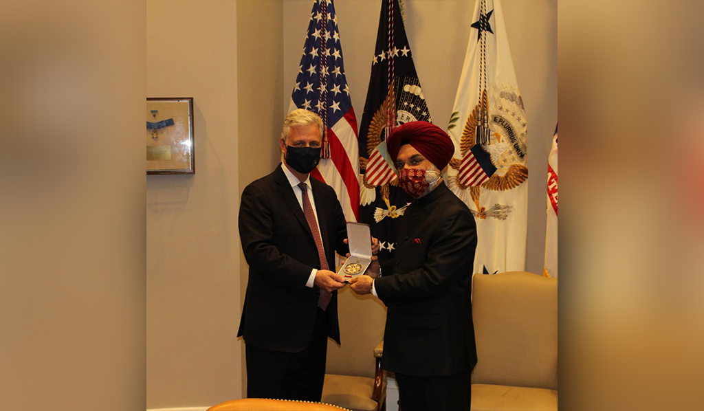 The award was received on behalf of the Prime Minister by the Ambassador of India to the United States Taranjit Singh Sandhu. At the ceremony, The Legion of Merit, Degree Chief Commander, was also awarded to the Prime Minister of Australia Scott Morrison, and former Prime Minister of Japan, Shinzo Abe.